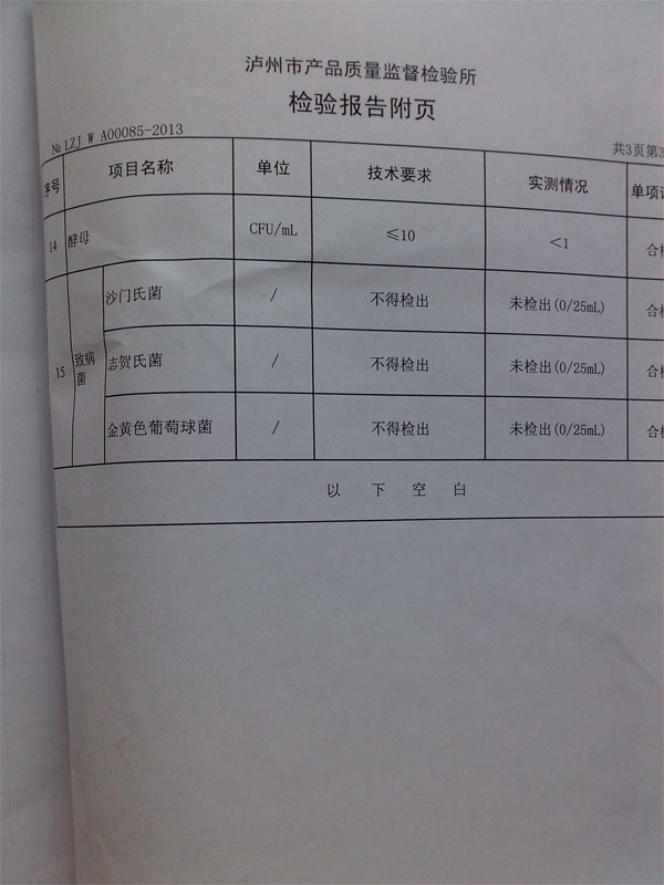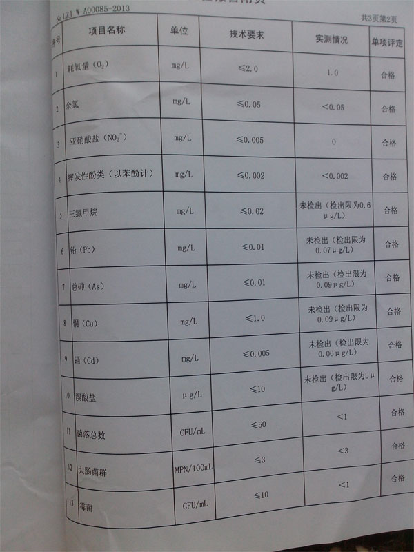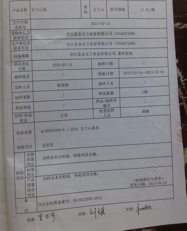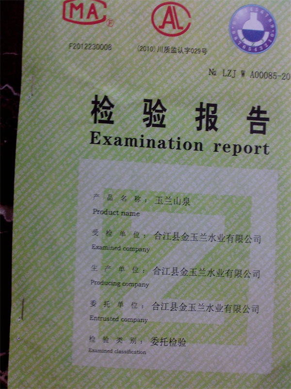今年3月份,国内桶状水频繁爆出质量问题,桶装水质量问题受到广泛关注,泸州市质量监督检验所对我公司生产的产品也进行的相关检查。检验结果显示,我公司生产的“玉兰山泉”桶装水各项指标均符合国家标准,没有出现农夫山泉等类似的问题,广大客户可以放心饮用。现将检验报告附在下面: